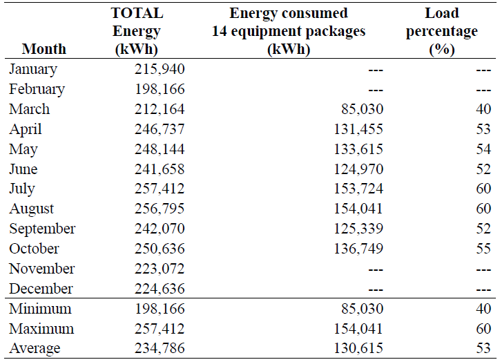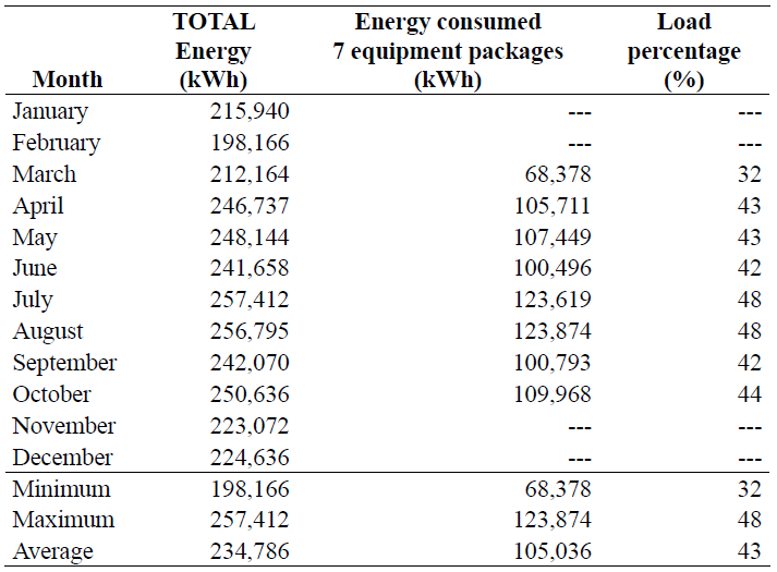 Table 3 reports the total consumption of the 14 equipment packages and their load percentage, in relation to the total consumption of the warehouse. Moreover, Table 4 shows that the consumption of the first seven equipment units that are turned on (the ones monitored in the field) represent approximately 80% of the energy consumption of all the air conditioning equipment.