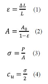 Where, e is the strain, AL is the change in length (mm), L is the original length (mm), A is the modified cross section area (mm2), Ao is the original cross section area (mm2), o is the compressive stress (kN/m2), P is the load (N), and cu is the unconfined compressive strength (kPa).
