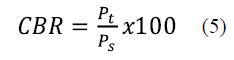 2) California Bearing Ratio (CBR). The penetration behaviour of the sample was obtained by conducting CBR test as per IS 2720 -part 16 [30], and calculated using equation (5). The sample was prepared similar to that for the unconfined compressive strength test and loaded statically. The CBR was defined as the ratio in percentage of force per unit area to penetrate the soil with 50 mm diameter circular plunger at a rate of l.25 mm/min to a corresponding penetration of 2.5 mm for standard material.