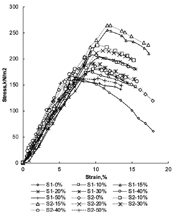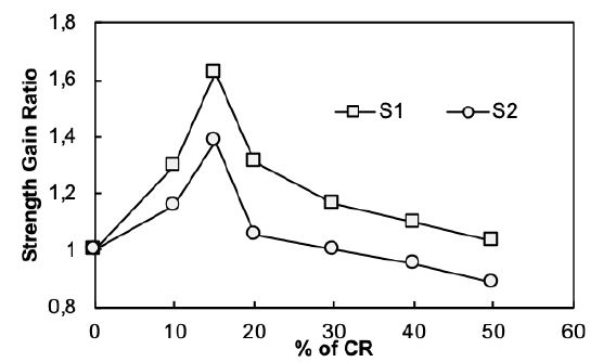 The compressive strength of the soil was found using equation (4). Figure 1 shows the stress-strain graph of Sl and S2 soils mixed with various proportions of CR (0, 10, 15, 20, 30, 40 and 50% by weight). The compressive strength of S1 and S2 were 160 and 191 kPa, respectively. Upon increasing the percentage of CR in the soil, the compressive stress decreased beyond 15% of CR intrusion. The strength increased to 260 kPa (38.5%) in S1 and to 263 kPa (27.7%) in S2. Strength gain ratio (treated soil strength to untreated soil strength) showed a typical increase in strength up to 15% and decreased after further addition. Beyond 40% for S1 and 30% for S2, the strength was less than the untreated soil (Fig. 2); hence, for highly compressible soil, the usage limit of CR is 40% and for low compressible soil, is 30%.