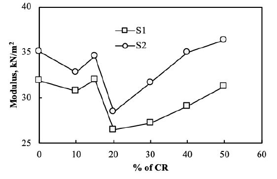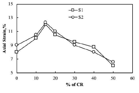 For highly compressible clay (S1), an initial addition of 10% CR to the soil reduced the modulus of the soil, whereas an addition of 15% CR increased the modulus to 32 kPa. However, the modulus values decreased drastically beyond 15% addition up to 20%, and then, they gradually increased; although they did not reach the modulus value of the unmodified soil. For medium compressible clay (S2), the initial modulus was 35.07 kPa. A 10% addition of CR reduced the modulus to 32.81 kPa, whereas a 15% addition increased it to 34.56 kPa. Subsequently, the modulus value fall and any further CR addition increased the modulus. For a maximum addition of 50% CR, the modulus value was 36.36 kPa, which was higher than the unmodified soil modulus. The initial behaviour for both soils modified with CR was the same, but after 15%, the soils showed different behaviours. Upon addition of 40% CR, S2 showed a modulus similar to that of unmodified soil; however, adding 50% of CR to S1 showed a modulus almost similar to that of unmodified soil (Fig. 3). The axial strain, taken as the strain occurred at failure stress for both soils, followed a similar pattern, being maximum in S2. Further addition of CR beyond 15% showed reduction in strain (Fig. 4).