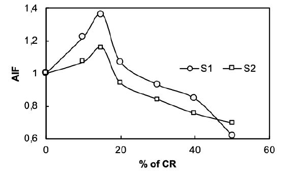 Up to 15% increase of CR increased AIF to maximum values of 1.36 (S1) and 1.16 (S2). Further addition of CR decreased the AIF reaching a value lower than the untreated soil. Additionally, upon adding up to 20% CR to soil, the AIF was higher than that of unmodified soil, which emphasizes the fact that CR influences the soil up to 20%, showing a peak value at 15% of CR.