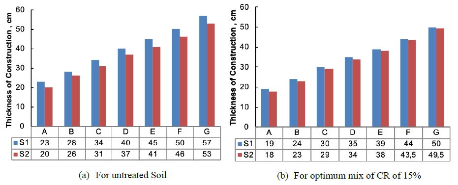 Highly compressible clay (S1) showed higher thickness for various numbers of vehicles compared to low compressible clay (S2), due to its highly compressible nature. When 15% CR was introduced into the soil by weight, the thickness of the layer reduced. For S1 soil, the reduction in thickness of the construction layer was higher than that of S2 soil (Fig. 8).