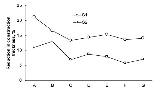 The thickness reduction for lower numbers of vehicles for S1 was around 21% compared to 11% for S2. With number of vehicles ranging between 15 and 45 per day, the reduction in thickness of layer decreased to 16% for S1 and increased to 13% for S2. By increasing the number of vehicles, the reduction in construction layer thickness of flexible road decreased. Moreover, the maximum reduction was observed for very low number of vehicles (0-15) for S1, whereas S2 showed higher reduction when vehicles ranged between 15 and 45 per day.