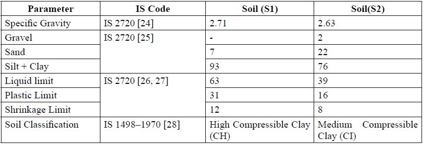 Soils were taken from two places in Chennai (India): S1 and S2. The properties of the soil (Table 1) were found using relevant codes of the Bureau of Indian Standards (BIS).