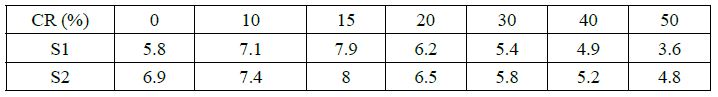 Table 2 shows the CBR values for different proportions of CR in S1 and S2. From these values, the Admixture Influencing Factor (AIF) and a ratio of CBR value of treated soil to untreated soil were calculated (Fig. 5).