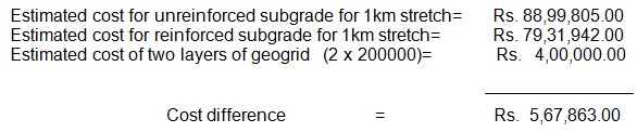 For the unreinforced subgrade CBR value the thickness required as per IRC: 37-2001 was 850 mm whereas when using the geosynthetic material as subgrade reinforcement the thickness was reduced to 540 mm. This reduces the cost of around around 8000 USD amouting to 6.4% compared to the unreinforced soil in pavement.