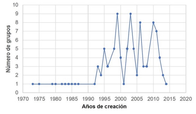 4) Clasificación según los años de formación. Los intervalos de tiempo de mayor aparición de grupos están entre 1995 a 2006 y 2010 a 2015, con un total de 56, tal como se muestra en la Figura 2.