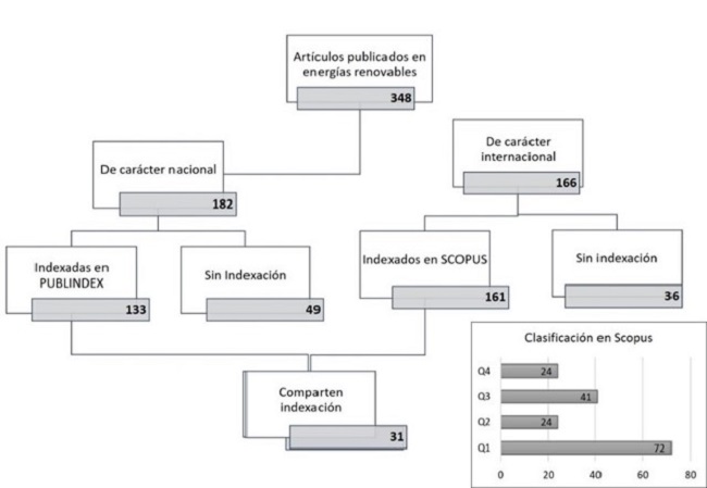 Los 348 artículos publicados en ER se dividen en las siguientes sublíneas: biomasa 42.8 %, energía solar 37.9 %, políticas y gestión energética 14.1 %, recurso energético renovable 13.8 %, energía eólica 10.1 %, implementación de energías renovables y enseñanza de las energías renovables 2.3 %. En la Figura 4 se muestra el número total de artículos publicados en temas de cada sublínea, donde es notable una mayor producción en biomasa y energía solar. En cuanto a la indexación de las revistas en las cuales se han publicado los artículos en ER, la mayor participación está en revistas de carácter nacional, pero también hay presencia de publicaciones en el ámbito internacional.