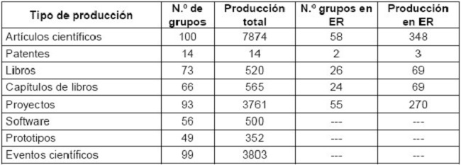 Es importante anotar que 40 grupos reportan como línea de investigación las ER, pero hay 24 más que, aunque no declaran esta línea de investigación, sí cuentan con productos en estos temas. Esto puede deberse a que en el momento de la creación del grupo no tenían contemplada esta línea, pero han ido incorporándola a sus investigaciones debido a las necesidades del medio.