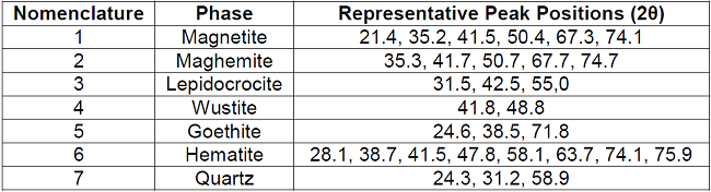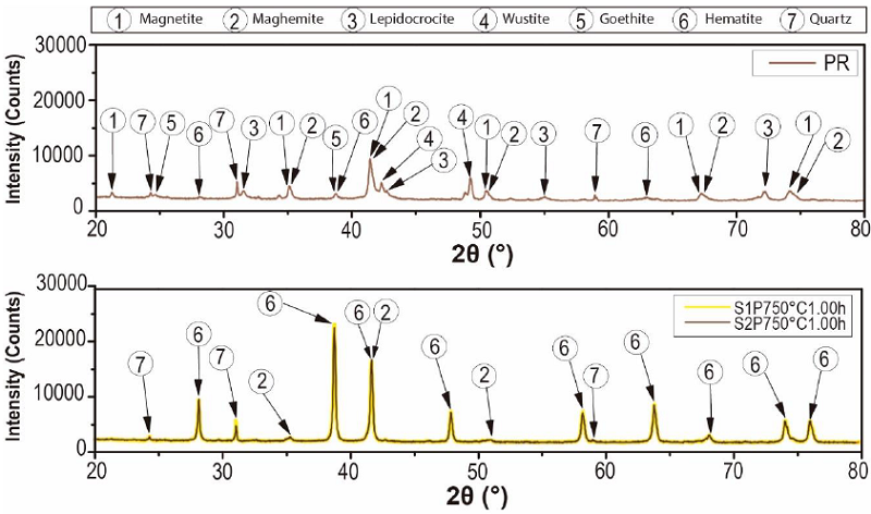 From the above, there was a good correspondence that mostly related iron oxide phases (magnetite, maghemite, lepidocrocite, wustite, goethite and hematite) to the experimental pattern of PR, which clearly agree with the high iron content reported by the results of XRF and with the phases of iron oxides that are generally found in steel corrosion products [19], [24]. Moreover, the presence of quartz was also in accordance with the results of XRF and to the usual presence of this phase that is reported as impurity in similar industrial wastes [5], [7]. Therefore, they were identified the seven chosen phases (numbered from 1 to 7 in the Table 2) in the PR diffractogram (Figure 1), after considering the approximate 2θ position of the most representative peaks of their associated theoretical patterns, which are also summarized in Table 2.