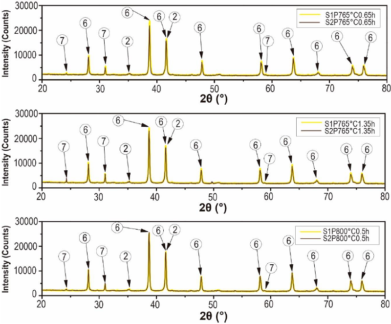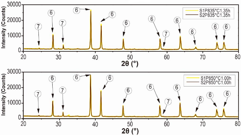 From Figure 1 is considerable the variation of the precursor phases (1, 2, 3, 4 and 5) in hematite (6), before and after the thermal treatment of the processed residue. The diffractograms of the two replicas of the obtained pigments show a very similar behavior in the different treatments where is observed a clear enrichment of the hematite from a calcination temperature of 750 °C. The comparison of the diffractograms of the PR and of the pigments obtained, evidences that the increase in the calcination temperature drastically decreases the original maghemite content due to its conversion into hematite, since it begins to transform from approximately 370 °C, as explain Cornell and Swchertmann [2]. For example, the diffractograms of S1P800°C1.00h and S2P800°C1.00h, show a reduction in the contribution of the maghemite and a clear increase in the intensity of representative peaks of the hematite.