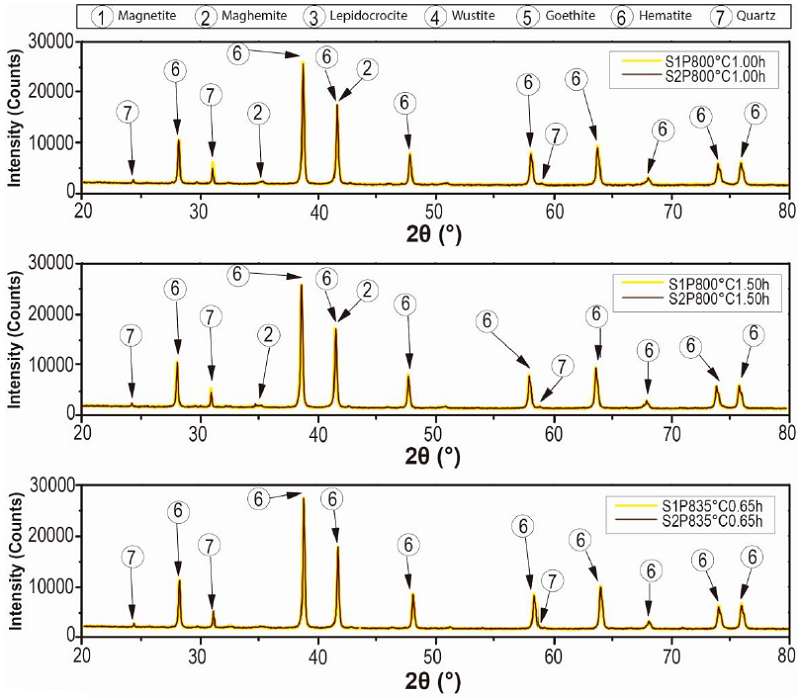 The explication of that situation was summarized by Mos et al. [20], since they demonstrated that a proper distinguishing of these phases by XRD is only possible with Co-Kα radiation (λ=1.7890100 Å) instead of Cu-Kα (λ=1.540552 Å), since the source of cobalt offers the resolution necessary to distinguish these phases or a mixture of them (γ-Fe2O3/Fe3O4) due to its greater depth of penetration in iron-rich samples, as is also points out by Whitfield [21]. According to the above, the identification of these phases would be incomplete in steel residues that have been widely described with diffractograms obtained with a copper source [1], [4], [5], [6], [8], [9], [10], [11].