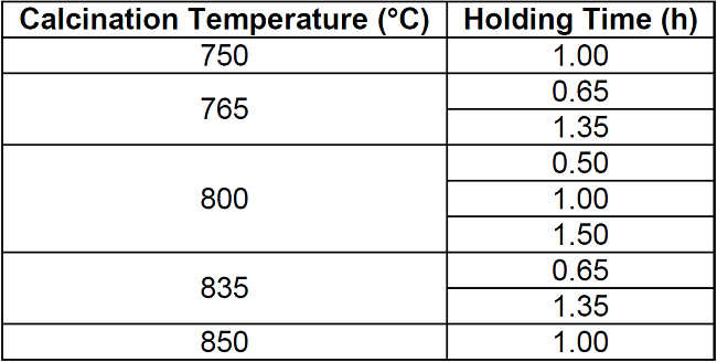 It can also be observed that the maghemite practically disappears from a calcination condition of 835 °C and 0.65 h. After calcining the residue (PR) at 850 °C for 1 h, the highest peak of hematite was obtained, which is in agreement with that obtained by Sikalidis et al. [9] It should be noted that other major phases such as magnetite, wustite and lepidocrocite completely disappear in all the calcined samples, since these phases are completely transformed at calcination temperatures between 600-800 °C [8], [9]. Apart from the precursor phases, it can be seen that the thermal treatment used did not affect the quartz contribution of the residue diffractogram (PR), which can be verified by monitoring the height of the representative peaks of this crystalline phase. This behavior follows the same tendency of the residue of mining origin used by Aguaiza and Aldás [7].