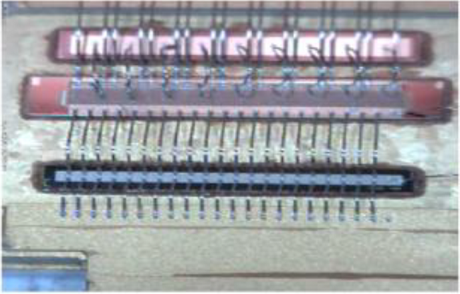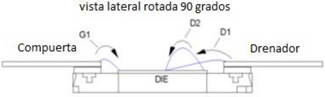 En frecuencias en el orden de los GHz y con potencia de varios Watts, deben considerarse los efectos de interferencia electromagnética de las inductancias mutuas de los wire-bonds. Para solucionar esto se realizó una prueba de diseño de experimento (DOE) extendido basado en [6] y [7], con el objetivo de probar el funcionamiento RF con diferentes alturas de bucle para los hilos de salida. En la Figura 1 se muestran las etiquetas G1, D2 y D1, que forman parte de la red de preadaptación, tanto en la puerta como en el lado del drenador. D2 y D1 representan el arreglo de wire-bonds en el lado del drenador, mientras que G1 representa el arreglo de wire-bonds en el lado de la compuerta. La Figura 2 muestra una foto de dicho RFIC sin encapsulado, donde se aprecia el die (transistor) en forma de bus-bar en la parte central de la imagen. Para la optimización de la altura de bucle D2, por ejemplo, se hicieron mediciones preliminares de ganancia, linealidad y eficiencia para tres valores diferentes de altura de bucle, con una señal estándar Wimax. El mismo procedimiento se utilizó para los demás hilos. La Figura 3 muestra los resultados para diferentes tipos de die, denotados por las etiquetas cc11r1 cc5r1 cc2r1 y cc11. La variación en el eje horizontal representa la altura del bucle D2; mientras que la variación en el eje vertical representa un tipo de die con diferente concentración de metalización.