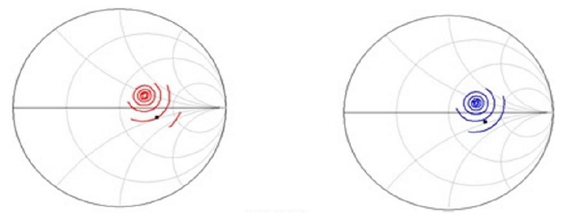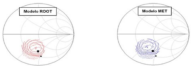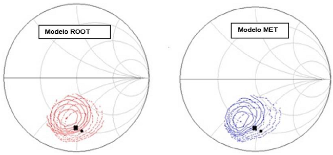 Ambos modelos fueron probados también bajo condiciones de Source-Pull. En esta prueba se midieron diferentes valores de impedancia de la fuente para obtener la mejor pérdida de retorno de entrada (IRL). Los resultados se muestran en la Figura 5. De este modo se lograron obtener los valores óptimos para las impedancias de fuente para los modelos mencionados anteriormente. Estos valores se comparan en la Figura 5 con el valor óptimo medido.