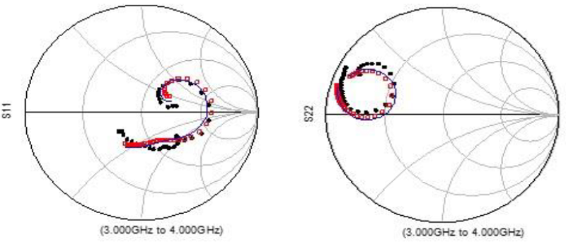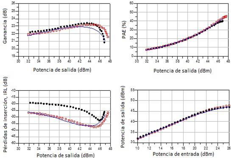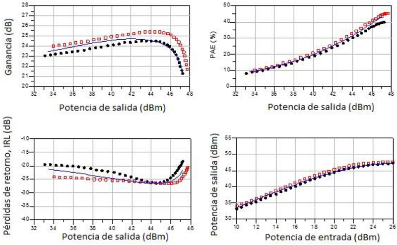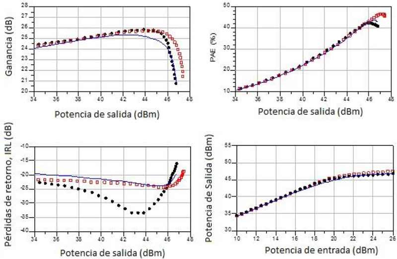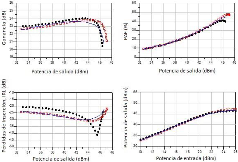 Se inició el análisis en condiciones de pequeña señal. Para ello, todos los elementos parásitos del dispositivo fueron medidos usando un analizador de redes y empleando el método indicado en [12]. Los modelos fueron implementados en ADS y validados en condiciones de pequeña señal y gran señal. Los resultados de parámetros S en estas condiciones se muestran en la Figura 4. Los puntos negros representan las medidas. Los cuadrados rojos indican la salida del modelo de ROOT, mientras que las líneas continuas sólidas de color azul simbolizan los resultados del modelo MET.