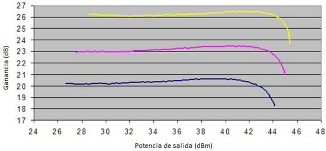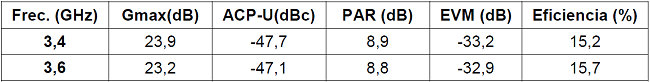 Usando herramientas de diseño CAD y con el método propuesto se logró construir un amplificador de potencia demostrativo en circuito impreso con n ancho de banda comprendido entre 3.4 y 3.6 GHz, el cual se detalla en [9]. Al polarizar el dispositivo en las condiciones adecuadas para evaluar el punto de compresión, y enviando una señal de entrada de un tono en onda continua, se obtuvo una ganancia superior a 22.8 dB, en condiciones de compresión 1dB, con una pequeña variación, cercana a 0.5 dB de 3.4 a 3.6 GHz, como se muestra en la Tabla 6. La respuesta del demoboard construido se midió también en condiciones Wimax. En [13], el RFIC se probó con una señal Wimax de 7 MHz. Para el presente trabajo se usó una señal de ancho de banda de 10 MHz con una modulación 64 QAM-3/4. La relación pico a promedio (PAR) fue de 9.5 dB a una probabilidad del 0.01 CCDF. Los resultados también se muestran en la Tabla 7. De esa tabla se puede ver además que considerando una potencia de salida de + 37 dBm de 3.4GHz a 3.6GHz, la eficiencia de las dos etapas es de aproximadamente el 15 % con una magnitud de vector de error (EVM) alrededor de -33 dB.