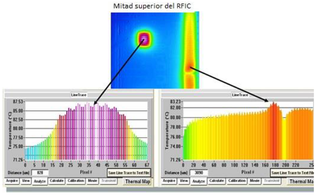 A partir de la prueba de infrarrojos se concluye que, en condiciones de DC, la distribución de la temperatura es casi constante para el RFIC. Para las condiciones de RF, la distribución de la temperatura es ligeramente más alta en el lado inferior. Para los cables de salida, la distribución de la temperatura en el lado inferior es casi 20 ° C más alta que en el lado superior. Sin embargo, tanto en DC como en RF se comprueba que las temperaturas máximas están por debajo de los máximos permisibles en un 20 %, lo cual garantiza la vida útil del amplificador [14] y demuestra la utilidad del modelo propuesto para predecir el comportamiento de este tipo de dispositivos.