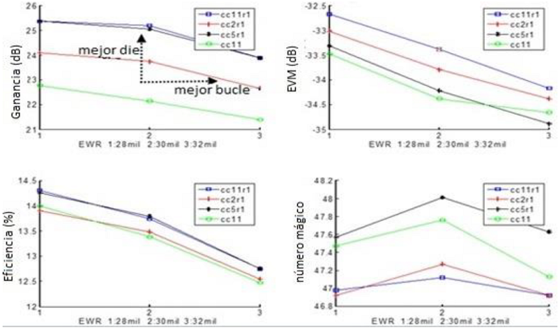 En esa figura es posible ver que la versión de die denominada "cc5r1", con 2 mils de altura de bucle, muestra en general un mejor comportamiento en los tres parámetros más importantes de un amplificador: de ganancia, eficiencia y linealidad (EVM). Se ha tomado como unidad de medida de longitud al “mil”, equivalente a la milésima de una pulgada, debido a que es la unidad estándar usada en este tipo de procesos. El término de “número mágico” que se muestra en la parte inferior derecha de la figura es una constante definida por el diseñador de RF, que representa el mejor compromiso entre los parámetros indicados anteriormente, dado a través de una ponderación matemática entre ganancia, eficiencia y linealidad. La mejora más importante en el DOE presentado es que nos permite elegir tanto el die con mejor metalización, como la mejor dimensión de la altura de bucle D2. De esta manera, el diseñador puede asegurarse de que el diseño del RFIC esté centrado y obtenga su mejor desempeño, evaluando los efectos de la inductancia mutua sin necesidad de simulaciones electromagnéticas, que son de elevado costo computacional para este tipo de amplificadores, ahorrando tiempo en el proceso de diseño industrial.