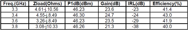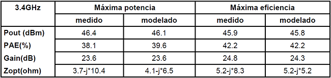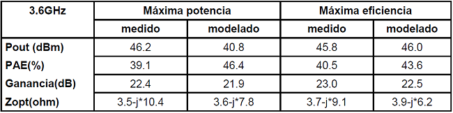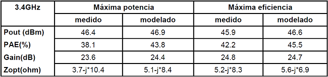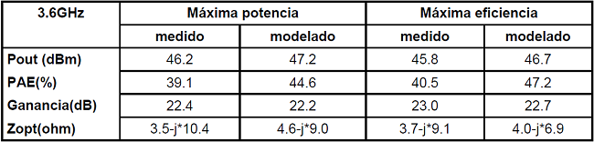 Las tablas 4 y 5 muestran la potencia, eficiencia y ganancia a 3.6 GHz. Comparando esos valores con los que se exponen en las tablas 2 y 3 se puede concluir que esos parámetros son casi constantes en 200 MHz. También se puede ver que el modelo MET brinda buenos resultados no solo a 3.4GHz, sino también a 3.6GHz.