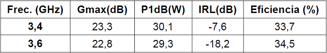 Una vez centrado el diseño, se realizaron medidas pulsadas directamente sobre el RFIC utilizando el sistema convencional de Load-Pull con sintonizadores pasivos [10]. El ancho de pulso fue de 9 µs con un ciclo de trabajo del 10 % para estudiar el comportamiento dinámico reduciendo los efectos de calentamiento al mínimo y manteniendo constante el punto de polarización de DC. Polarizando el dispositivo con 28 voltios en drenador, 70 mA de corriente de drenador para la primera etapa y 280 mA para la corriente de reposo para la segunda etapa, fue posible capturar la expansión de ganancia típica de esta tecnología [8]; y, en consecuencia, en este punto se midió la correcta potencia en condiciones de compresión 1dB. La Tabla 1 resume los resultados de las medidas mostrando una eficiencia de drenaje de las dos etapas del 40 % para la frecuencia más alta.