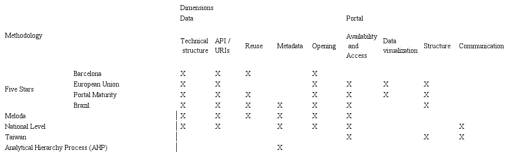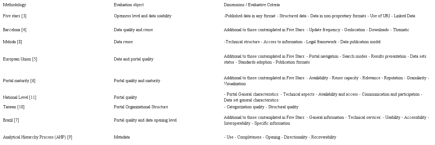 Each methodology provides a different approach to the extent that its evaluation criteria is raised, which may lead to the studied element (portal or data) having different quality levels, depending on the used methodology. However, it is not unknown that the approach to a more real quality result is given by the combination and complement of methodologies and models that allow a greater number of aspects to be covered.