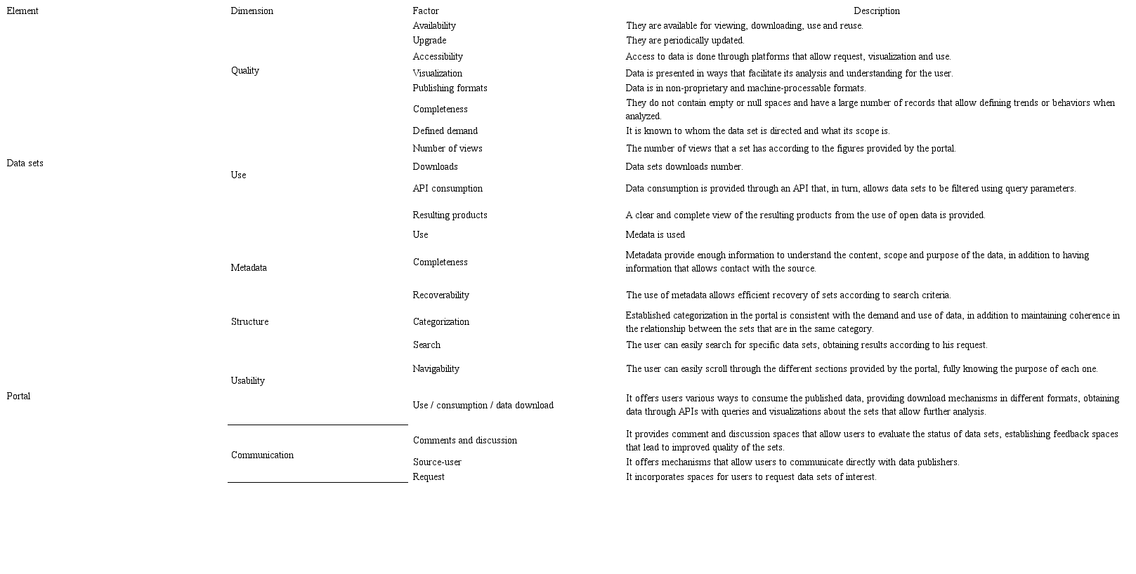 Taking as reference the methodologies presented in Table 1, the evaluation of open data from two approaches is proposed: 1) Published data, covering quality, use and metadata, and 2) Portal, highlighting aspects of its structure, usability and communication mechanisms. Each dimension is composed of several factors, whose general criteria are explained in Table 3.