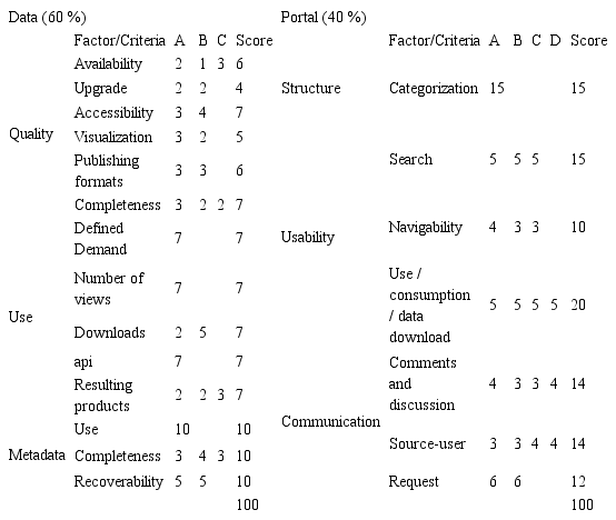 As part of the proposed methodology, a quantitative measurement system is proposed with the objective of scoring each of the presented criteria (Table 3). Each approach, portal and data has a maximum score of 100 points, distributed as shown in Table 4. The final score will be:
