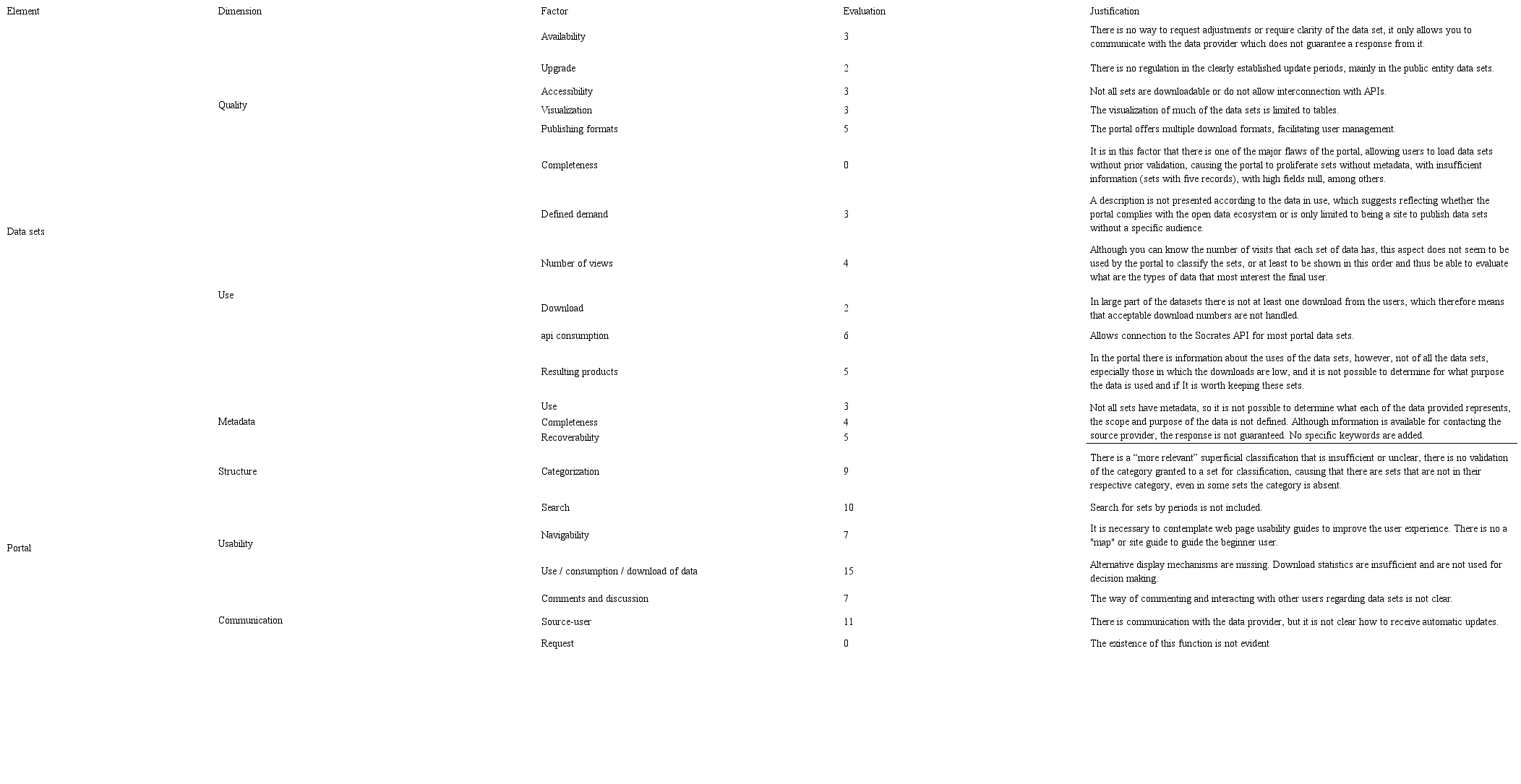 With the aim of evaluating the methodology, it was applied in the open data portal provided by the Colombian government (https://www.datos.gov.co/), based on the experience of a group of users, both experts as inexperienced. The qualification obtained is presented in Table 6, which also summarizes the main aspects that justify the evaluation of each factor or criterion.