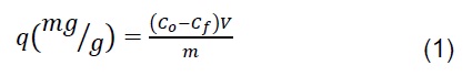 Where Co and Cf (mg/L) are the initial and final concentration of Cr(VI), respectively, V (L) is the solution volume and m (g) is the bioadsorbent mass used in the experiments.