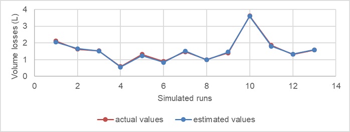 2) Simulation.In order to verify the predictive capacity of the neural network, already trained and validated, the topology (6-4-4-1) was used to simulate 13 initial aging conditions. These values were determined as the average of the thirteen months of research for each variable analyzed, to ensure the interpolator character of the network. The quality of the model can be seen in Figure 1, where the actual values and those estimated by the neuronal model for the different initial conditions are shown. The average error in the estimate is 3.03%, the maximum error being 7.4%.
