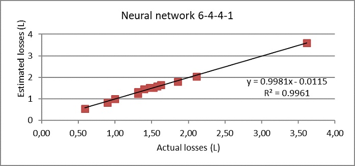 For the selection of the optimal number of neurons in the hidden layer, three criteria were taken into account: the mean square error in the validation of the model (MSE), the average absolute error (MAE) and the correlation coefficient (R) between the values of losses estimated by the neuronal model and the real values. [9-10].