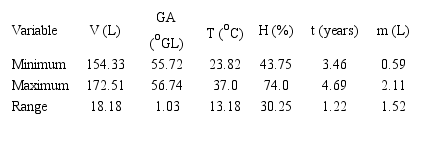 A data with 900 instances and ten variables were obtained, five of them qualitative: product, track, date and horizontal and vertical positions; while the remaining: aging time, volume, temperature, humidity and initial alcoholic degree are quantitative. The initial data matrix was reduced to 546 values as it presented incomplete measurements for three barrels (19, 21 and 159) and the period from February to September 2014.