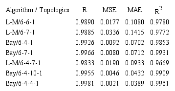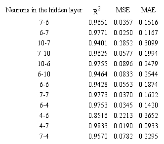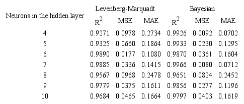 From Table 2 it is shown that the coefficient of determination values are in the range of 0.9271 to 0.9966; the mean square error values are between 0.0080 and 0.0978; while the absolute error is in the range of 0.0702 to 0.2734. By following the criteria of the highest coefficient of determination and the lowest error value, the best-performing neural networks have the structure 6-6-1 and 6-7-1 using the algorithm LM and 6-7-1 and 6-4-1 using the Bayesian algorithm.