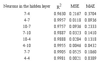 1) Topology of the neural network.The number of neurons in the hidden layer was varied from 4 to 10 with each of the training algorithms used (Levenberg-Marquadt and Bayesian) and the behavior of all topologies were compared. The coefficient of determination (R2) of the losses for each of the topologies, as well as the mean square error (MSE) and the mean absolute error (MAE, are shown in Table 2.