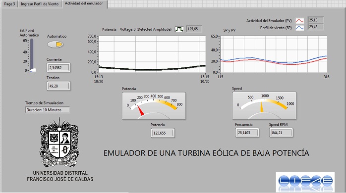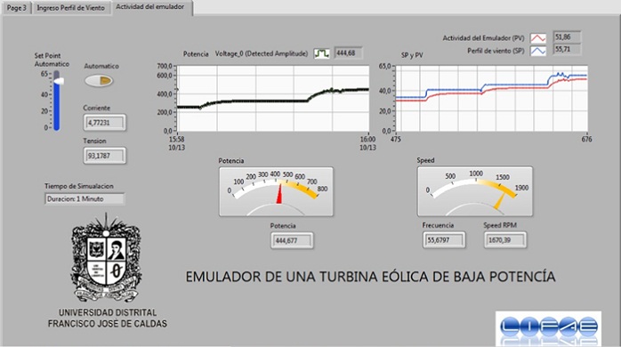 The emulator presents two operating options: The first one is one in which it is possible to load different speed data into the developed software. Such data are associated with a particular power that takes into account the selected wind profile. The second operation option is manual control of the wind speed, which depends on the frequency.