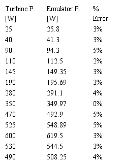 The test of the emulator in a manual way showed that on average, the emulator has an error margin less than 6%, compared to the data provided by the turbine manufacturer, which makes the emulator a reliable element to operate in a controlled laboratory environment.