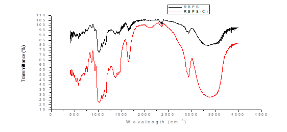 From the FTIR analysis shown in figure 1 before adsorption, records between 3000 and 3500 cm-1 are highlighted where unsaturated =CH- (alkenes and aromatics) may exist, also between 3200 and 3500 cm-1 amines and small carbonyl overtone signals may appear due to stretching vibrations of the O-H bond. The peak of 2927.94 cm-1 is attributed to possible vibrations of C-H methyl, methylene and methoxy groups, between 2000 and 2500 cm-1 there are signs of alkenes and carboxylic acids that may be due to the stretching of O-H. Peaks close to 1650 cm-1 are also recorded which indicate the presence of functional groups of cellulose, hemicellulose and lignin due to stretching of C=O and C-O by the vibrations of carboxyl groups of pectin, hemicellulose and lignin [1, 19, 21, 22], and also may indicate the presence of aromatic rings due to hydrogen vibrations representing the stretching of C=C [23].