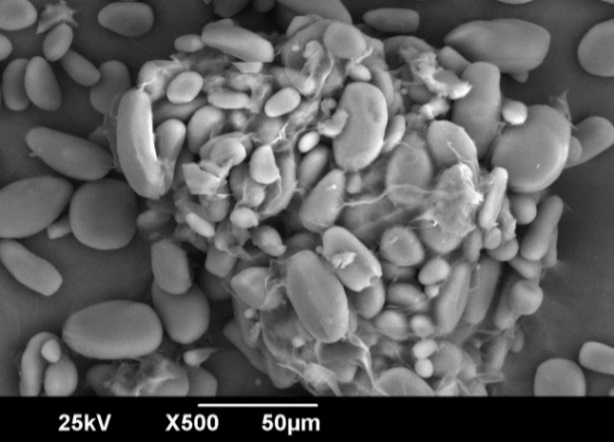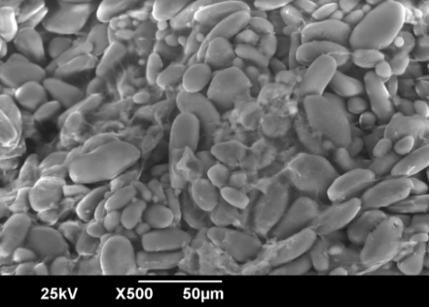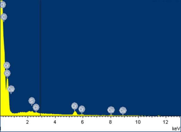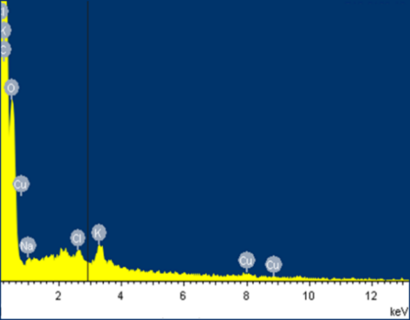 The EDS analysis shown in Figure 3 revealed that the elemental composition of the material is mainly carbon and oxygen, these being the main elements in weight % for the residual biomass of plantain starch: C (58.32), O (41.07), K (0.24), Na (0.20), Cl (0.10) and Cu (0.07). The presence of Cr (VI) in the spectrum after the removal process is observed with 1.12 % in weight.