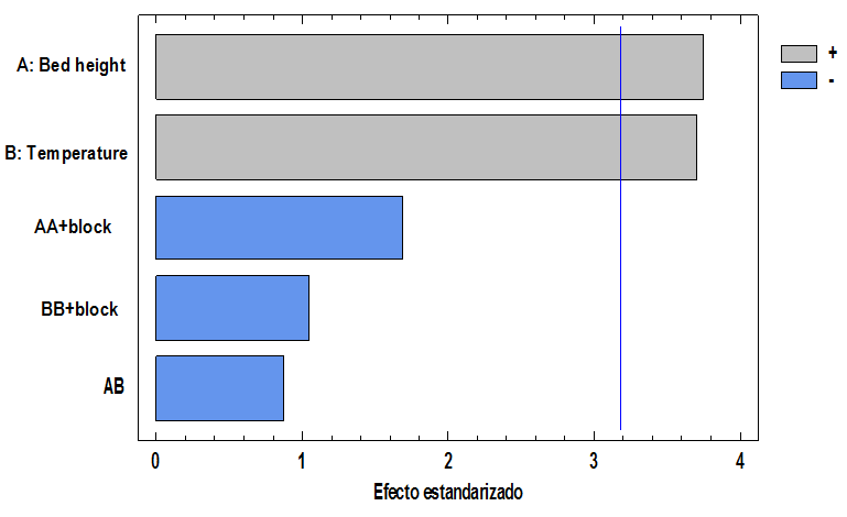 The real effects of the variables studied were analyzed by the software Statgraphics Centurion employing of the Pareto diagram shown in Figure 4, it is observed that the two variables: bed height and temperature have a significantly positive effect on the removal of Cr (VI) ions, in addition that the adsorption efficiency is favored with an increase of both variables.