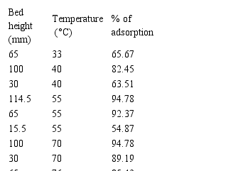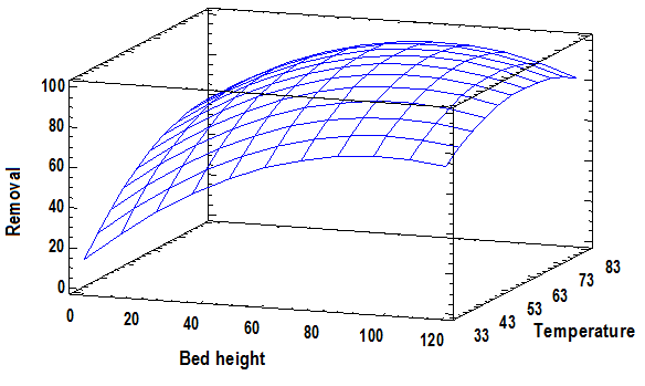 From the estimated values on the response surface, in order to have a high efficiency in Cr (VI) ion adsorption was obtained that the optimal values to maximize the removal at 99.23 % corresponding to a bed height of 81.49 mm and a temperature of 68°C.