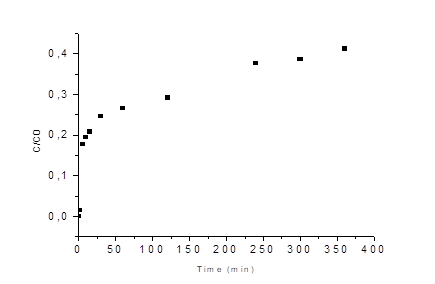 In order to carry out the determination of the bed life, the values of the factors that gave the highest removal were selected and implemented for the packaged column configuration and operation of the adsorption tests, to carry out the establishment of the bed life and breakpoint through a forward curve over a period of six continuous hours. The forward curve is shown in Figure 6.