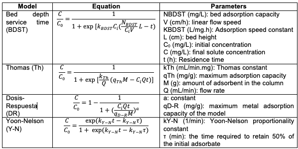 The breakage curve was made at the optimal conditions found when applying the Response Surface Methodology (RSM). The models used to predict the performance of the rupture curve, calculating the process constants and evaluating the capacity are shown in Table 1.