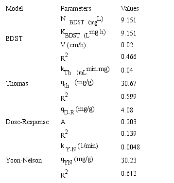 The metal ion showed a fast adsorption speed in the first minutes, which can be explained by the high availability of active sites and Cr(VI) [45]. As the solution continued flowing, the output concentration started to increase, however during the 6 hours of the process the saturation of the material was not reached, indicating the high adsorption potential of the material under study, with a maximum adsorption capacity of 29.85 mg/g [8]. The parameters of adjustment to the adsorption models of these experimental results were adjusted to each of the Dose Response, Yoon-Nelson, Thomas and BDST models are shown in Table 3, this in order to describe the behavior of the column.