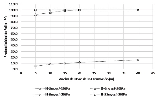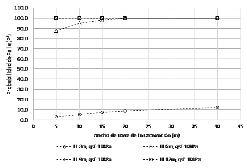 En las Figuras 8 y 9 se presentan los resultados de la probabilidad de falla Pf por falla de fondo para los escenarios analizados con sobrecarga en superficie de 10kPa y 20 kPa, respectivamente, incorporando el efecto de la sobrecarga equivalente en el fondo de la excavación qsf. En las dos figuras, se puede observar que, para todos los anchos analizados, la excavación de 3 m de profundidad presenta valores de probabilidad de falla que oscilan entre 3% y 15%, aproximadamente. En este sentido, varios autores [10, 18-19] mencionan que una probabilidad de falla superior al 10 % puede asociarse a estados indeseables de seguridad, en especial porque el índice de confiabilidad (), puede ser inferior a 3. Estas condiciones se cumplen para valores de Pf mayores a 9 %, en los modelos de simulación analizados. Para las demás profundidades, la Pf oscila entre el 88 y el 100%, lo cual indica claramente que las excavaciones de mayor profundidad, para todos los anchos de base analizados, poseen criterios de estabilidad geotécnica inaceptables.