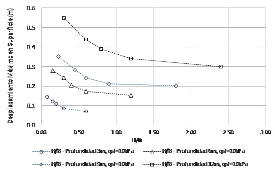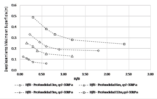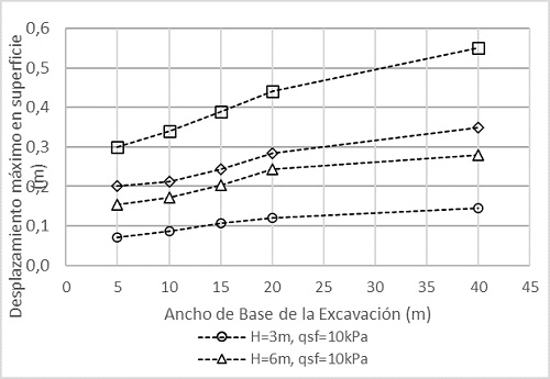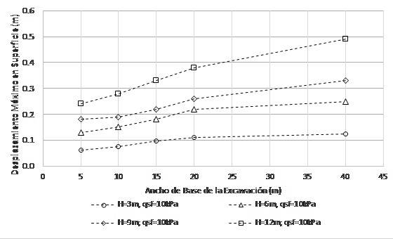 Las Figuras 10 y 11 muestran los desplazamientos máximos obtenidos en superficie a partir de las simulaciones por elementos finitos para sobrecargas de 10 kPa y 20 kPa, considerando las diferentes dimensiones de las excavaciones analizadas y la sobrecarga en el fondo. Las tendencias de los valores de los desplazamientos en superficie muestran que la magnitud de los asentamientos es proporcional a la profundidad y ancho de base de la excavación. No obstante, los mayores valores de asentamientos se producen para la mayor sobrecarga en superficie, aumentando entre un 12 y 21 % para los anchos de base de 20 m y 40 m.