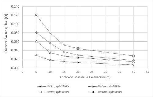 La variación de la distorsión angular () en superficie para las excavaciones analizadas se presenta en las Figuras 12 y 13, para las dos sobrecargas aplicadas en superficie y la aplicación de sobrecarga qsf en el fondo de la excavación. Las figuras sugieren que a medida que aumenta el ancho de base disminuye la distorsión angular, esto debido al aumento de la longitud de la zona afectada por la deformada en superficie de manera proporcional al ancho de base de la excavación luego de la simulación numérica. Es claro que el aumento de la distorsión angular es proporcional también al aumento de la profundidad de la excavación, de manera independiente a la magnitud de la sobrecarga en la superficie, pero las variaciones de las distorsiones angulares pueden superar el 10% para la sobrecarga de 20 kPa en relación con la sobrecarga de 10 kPa.