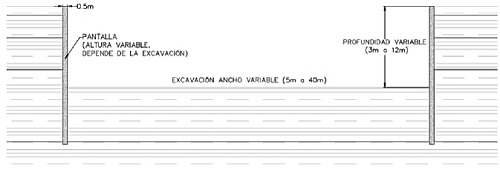 Para la realización de los análisis paramétricos de estabilidad de la excavación y estimación de desplazamientos en la superficie del terreno, se plantearon modelos de simulación para excavaciones de anchos variables entre 5 m, 10 m, 15 m, 20 m y 40 m con profundidades de 3 m, 6 m, 9 m y 12 m, para cada caso. Así mismo, se definió que las excavaciones incluyen como sistema de apuntalamiento muros-pantalla en concreto de 0.5 m de espesor, construidos a partir de técnicas convencionales de pre-excavación y fundición en el sitio (Figura 1).