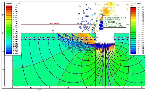 Los análisis deterministas y probabilistas del ELU fueron realizados considerando condiciones de flujo de agua establecido en las arcillas para el sistema de excavación, por lo cual, se incluyeron líneas piezométricas derivadas del análisis de flujo bidimensional para una posición del nivel freático de 3.5 m bajo la superficie del terreno. En la Figura 2 se presenta un ejemplo de la evaluación del factor de seguridad y la probabilidad de falla para una excavación de 3 m de profundidad con ancho de base 10 m, y en la Figura 3 se presenta la evaluación del (ELU) para una excavación de 6 m de profundidad y 10 m de ancho de base. En la Tabla 3 se presentan los valores de las variables estadísticas asociadas al análisis probabilista de los estados límite últimos para las excavaciones analizadas, para cada uno de los materiales de la Tabla 1.